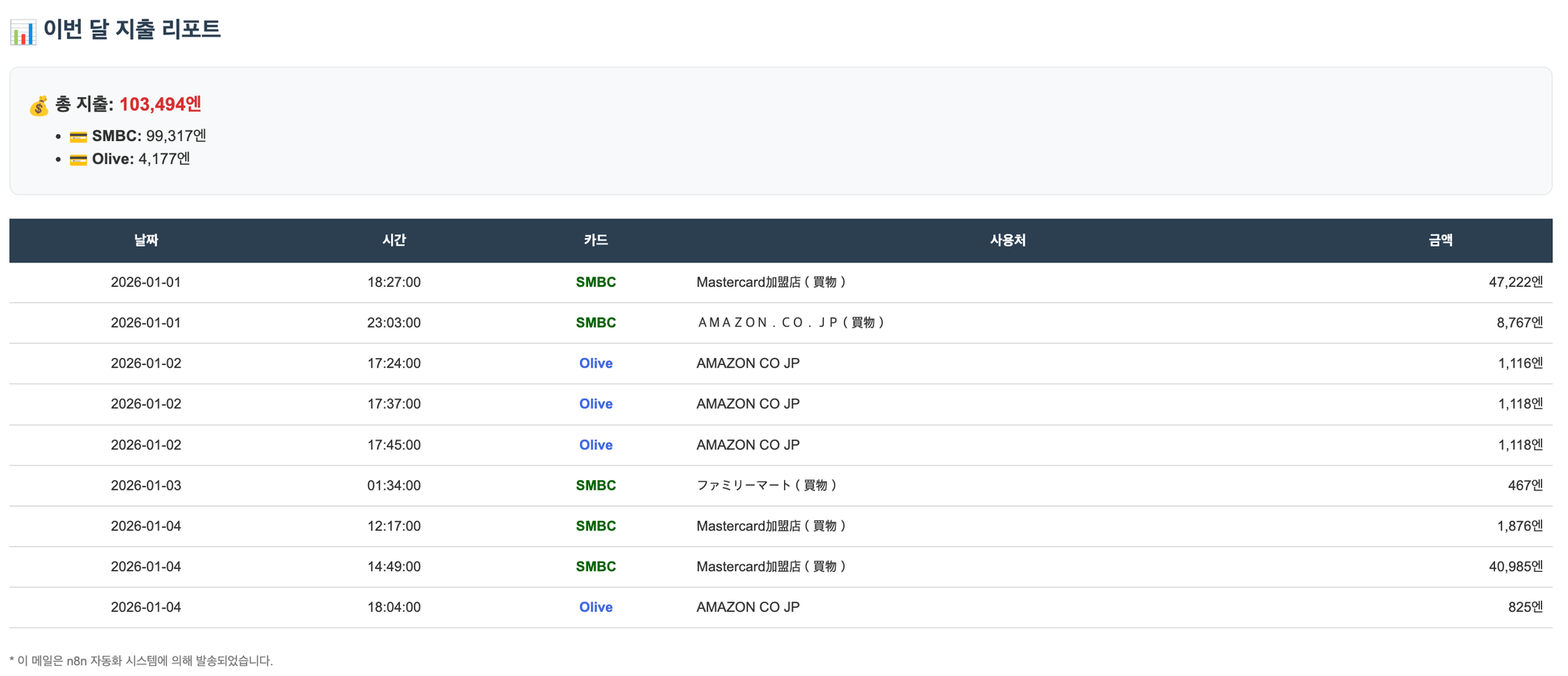 - 월간 리포트: 매월 1일 아침 9시, 지난달 총지출액과 카드사별(Olive/SMBC) 사용 금액이 정리된 예쁜 HTML 메일이 도착한다.